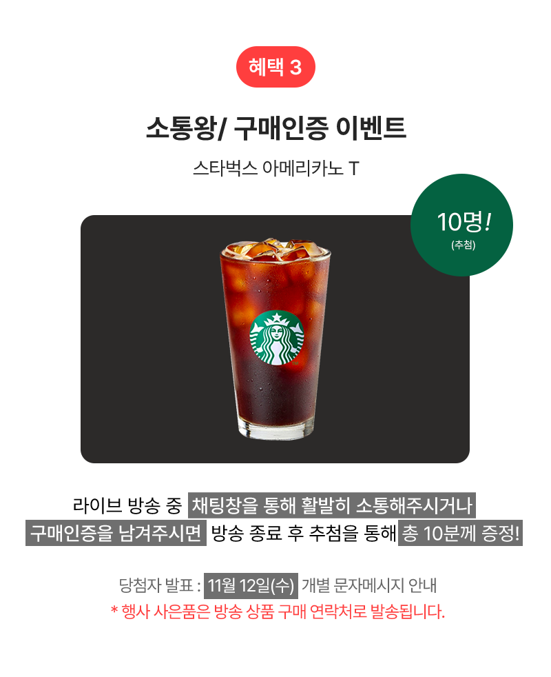 소통왕/구매인증 이벤트는 방송 중 댓글에 “구매인증“을 남겨주신 분과 댓글로 활발히 소통해주신분 중 추첨을 통해 10분께 [스타벅스 아메리카노T]을 안내된 일정에 증정합니다.