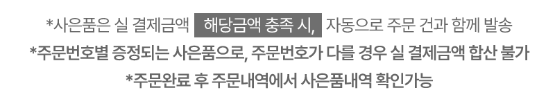 구매금액별 사은품은 멤버십할인, 할인쿠폰 등을 적용한 이후 최종적인 실결제금액 기준으로 지급되며, 개별주문건의 구매금액 합산은 불가합니다.